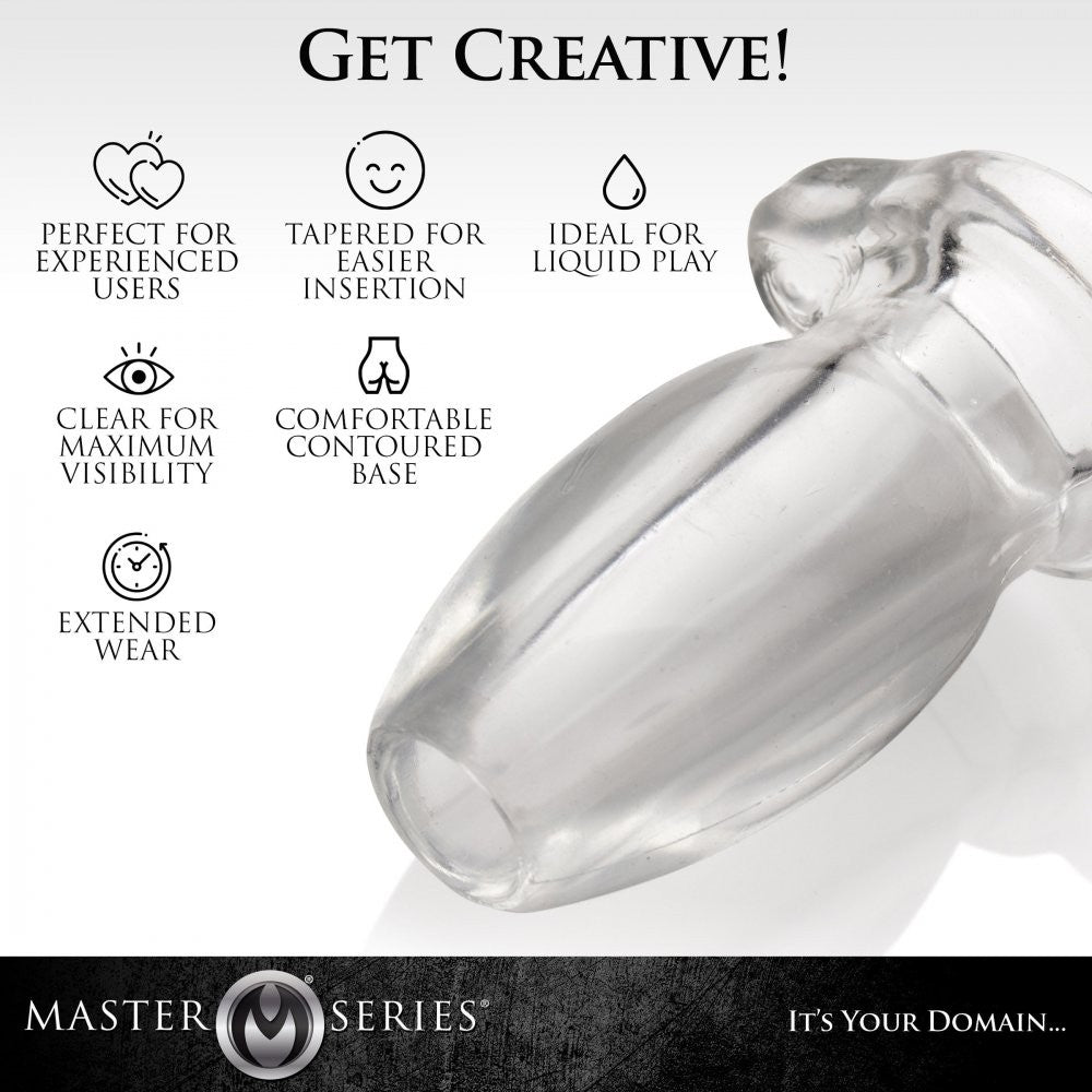 Available as a small or large plug, these hollow anal accessories allow you to glimpse into the forbidden depths of your plaything's fuck tunnel! The see-through material allows you to watch their inner walls contracting around the butt plug. The hole can be used to peer through, or even as an entry-way for a deep enema or other fulfilling insertion. The ergonomic base allows it to sit between your cheeks comfortably for long play sessions. This material is compatible with water-based and silicone lube. Clean after use with mild soap and warm water.