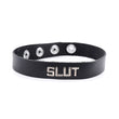 Show off your property or express yourself with this Slut collar. Identification collar is made of black leather, with four snaps and has steel letters. Collar is 0.75 of an inch in width and can adjust in length from 14" to 17".