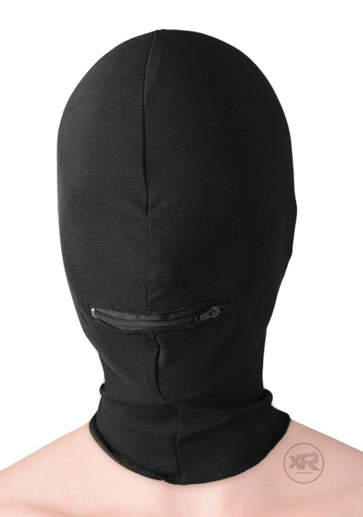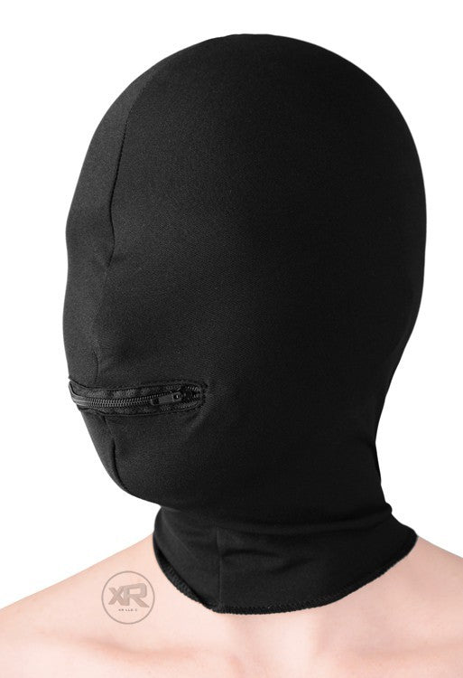 This has no eye openings and a zipper closure over the mouth, yet is comfortable and allows for a wide variety of movement. It is made of a black spandex material. It's less restrictive than other hoods. Spandex is very stretchable allowing this hood to fit all heads.