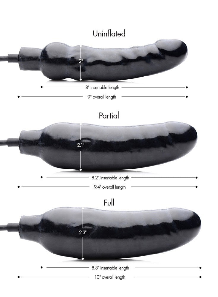 • Size: Uninflated: 8.5 inches in total length, 6.5 insertable, 1.75 inches in diameter; Inflated: 10 inches in total length 9 insertable, 2 inches at head, 3 inches at base