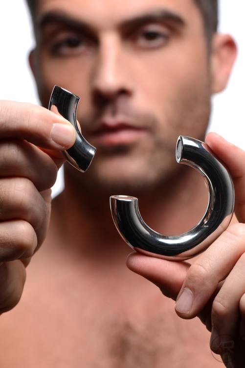This heavy, stainless steel ball-stretcher opens and closes magnetically, with a portion that pulls off so that you can slide your scrotum in. Once the ring is secured, savor the 7.5oz weight yanking down on your balls while you jack off, get punished by your lover, or even go about your daily routine! The incomparable stimulation will intensify your sexual experience and heighten your climax! Clean after use with mild soap and warm water.