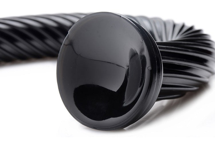 Get filled up to maximum capacity by an extra-long dildo, textured with swirling spirals to massage your inner walls! Made of a flexible, but firm phthalate-free material, this extreme penetrator will comfortably conform to the curves inside your body. The suction cup base allows you to mount it to a smooth, hard surface and also ensures that it is anal-safe. If no shaft is ever big enough for you, if no cock has ever reached deep enough... prepare to get hosed! This monster dildo is compatible with both silicone and water-based lubricants. Clean with warm water and mild soap.