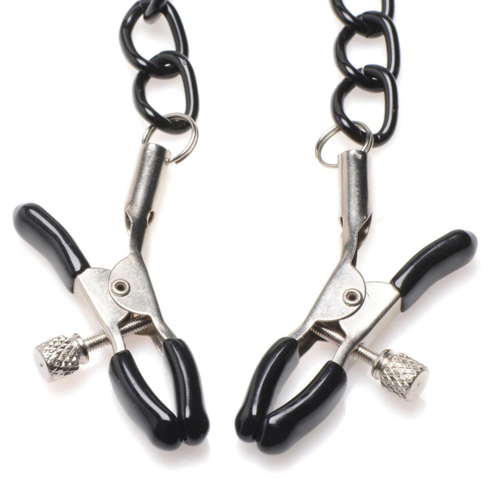 - Adjustable Collar and Clamps: The neoprene collar has a buckle closure that is easy to adjust for optimum comfort. Attached to the collar is a chain that leads to the clamps. Each clamp is coated with a rubber tip to protect delicate skin and is easily adjusted; simply twist the screw to increase or decrease pressure on the nipple.