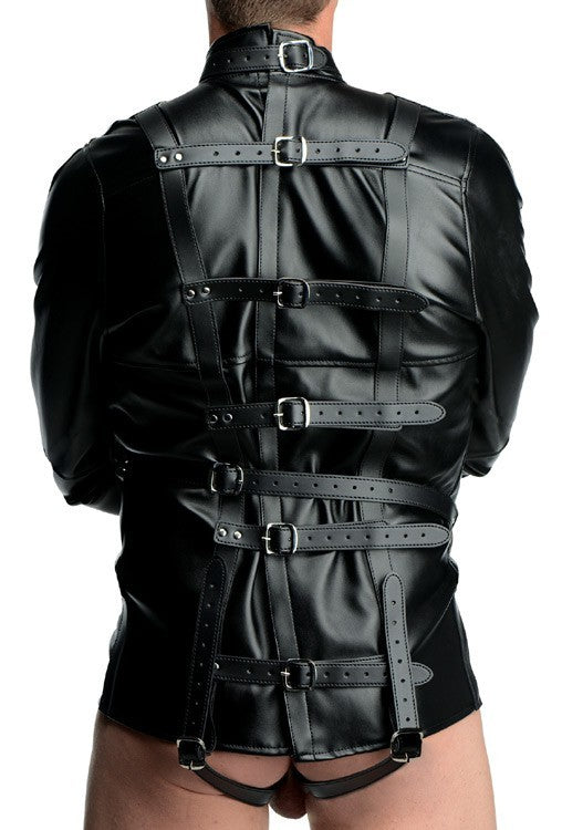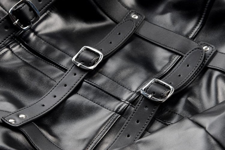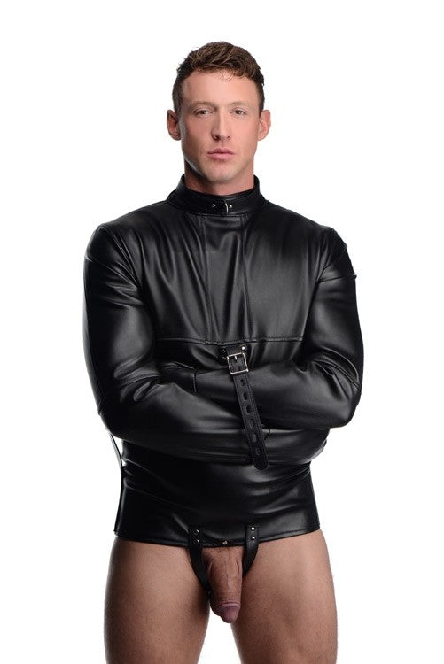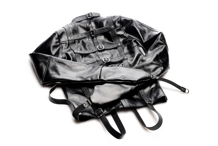 Immobilize your lover in this attractive medical fetish classic! Made of a leather-like material, this heavy-duty restraint will keep them confined while your hands roam their helpless body. The interior is lined with satin so that they will be luxuriously comfortable, even as they suffer your desires. Tighten the 5 adjustable buckles up the back and cross your slave's arms, buckling the sleeves together behind them. A strap for their forearms attaches to the front to keep them from wiggling around too much. The double crotch straps make this straight jacket ideal for male and female bodies, keeping their genitals exposed for your use. Finally, a collar with an O-ring allows you to attach your favorite BDSM accessories, such as a leash or ropes. Your plaything will be powerless as you bring your most taboo fantasies to life.