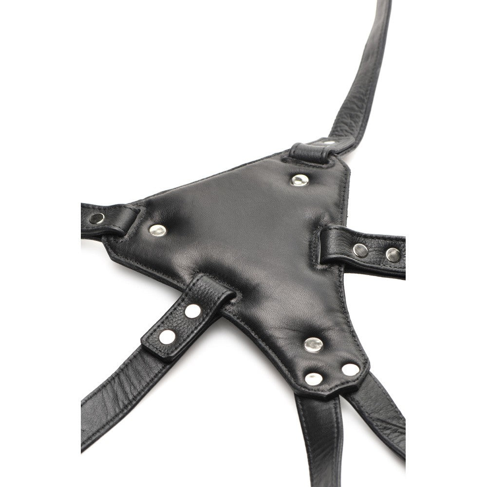 - Pelvic Padding: The triangular strip of leather provides extra padding for the pelvic area to reduce chafing and bruising while using the strapon, as well as a flat surface for the bottom of the strapon dildo to placed against.