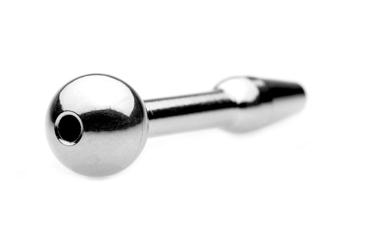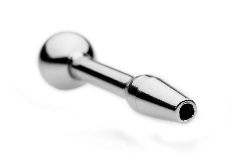 Stuff that shaft with a petite plug that still allows you to cum or piss! Slide this smooth stainless steel rod down your cock to enjoy the unique sensation that sounding enthusiasts crave! As the metal widens gradually, your cock will have to accommodate it! The Chasm will send pleasure into the tip of your dick, and it will spread throughout your whole body! The ball at the tip will keep the plug from slipping into you too far, and will also make your dick look sexy as hell. Have you been bad? Does your owner need to fill up your cock as a punishment? If you're allowed the comfort of pissing or the pleasure of cumming, this hollow plug will allow you to do both. Stainless steel is hypoallergenic and non-porous so sanitation is easy with a little soap and water.