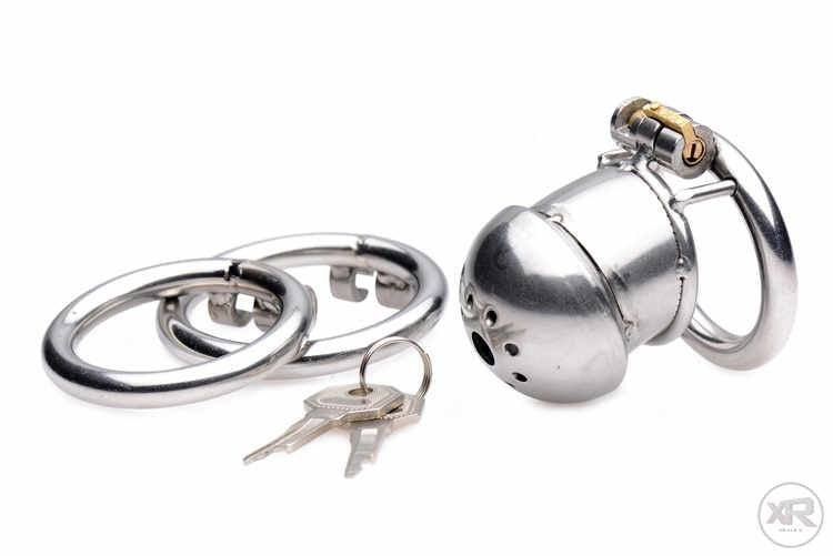 Out of sight, out of mind! Let your plaything know that their pleasure doesn't matter so they can get back to pleasing you! This chastity device allows you to keep that thing between their legs completely under your control! Choose from three sizes of O-rings to squeeze their cock and balls through, depending on how comfortable your slave is allowed to be. An internal locking system creates a more streamlined aesthetic, so that you don't have to look at a bulky lock. Just use the key to straighten out the locking device before inserting it into the hinges. Then, turn the key again so that your fucktoy is at your mercy! Stuff that useless penis into this stainless steel cage so that your slave won't be distracted by their own pitiful desires.