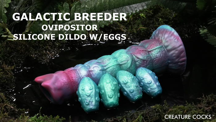 - Fantasy Ovipositor Dildo: This gorgeous teal, blue, and red ovipositor has an alien symbol on one side, unique texture along the segmented, bulging shaft, and an open-mouthed head for 4 squishy eggs to come out of!