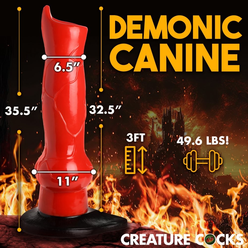 There is nothing quite as eye-catching, conversation-sparking and erotic as a giant hound dildo. Get all the attention you want with this bright red Hell-hound dong! It's horny and bigger than ever! It weighs 49 lbs and is almost 3 feet tall with a shiny, ready shaft and a deep, black base. Make a statement by adding it to your home decor, bring it to a trade show to attract customers and start conversations, incorporate it into a sci-fi or fantasy film, or even bench press it at the gym! Made out of PVC, it is firm, smooth and flexible. The suction cup base helps keep it secured to the floor so it doesn't tip over. To clean it, use warm water and mild soap, then spray with a toy cleaner. Wipe with a soft cloth and let air dry. When lifting it use proper lifting positions in order to not hurt your back. If you attempt to ride this monster, adventure at your own risk!
