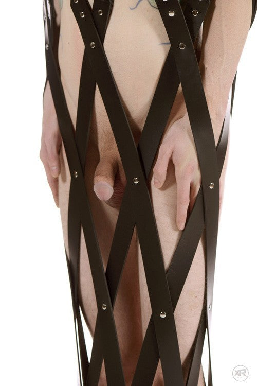 With this rubber strap cage, your partner steps onto a platform base and becomes surrounded with durable rubber straps. The straps are designed in a downward crisscross pattern. Their body weight pulls down on the cage, bringing the straps in closer to them and keeping them at bay. Think Chinese finger trap when figuring how this product will work in your next round of bondage play.