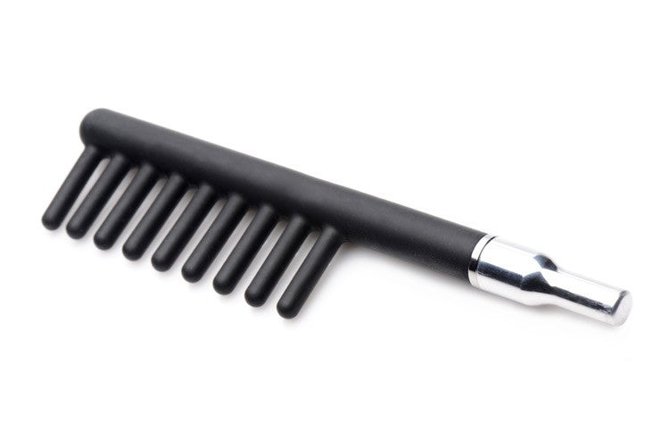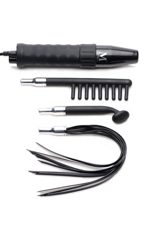 Enjoy electrifying erotic excitement with this exclusive Violet Wand kit, featuring 3 sadistic silicone attachments! The mushroom-shaped attachment focuses the electric current to pinpoint each jolt into your plaything's vulnerable flesh. The comb has 9 teeth that spread the E-stim along a length of skin in 9 sharp zaps. The flogger is adorned with soft falls that pack a mean bite, whether you're swinging hard for impact, or gently teasing along their body. Adjust the intensity of the electrosex transmission, from tickling tingles, to sizzling shocks! The wand has an ergonomic silicone handle so that you maintain a firm grip, as well as a long cord to give you plenty of room to move around your prey. Compatible with most violet wand attachments.