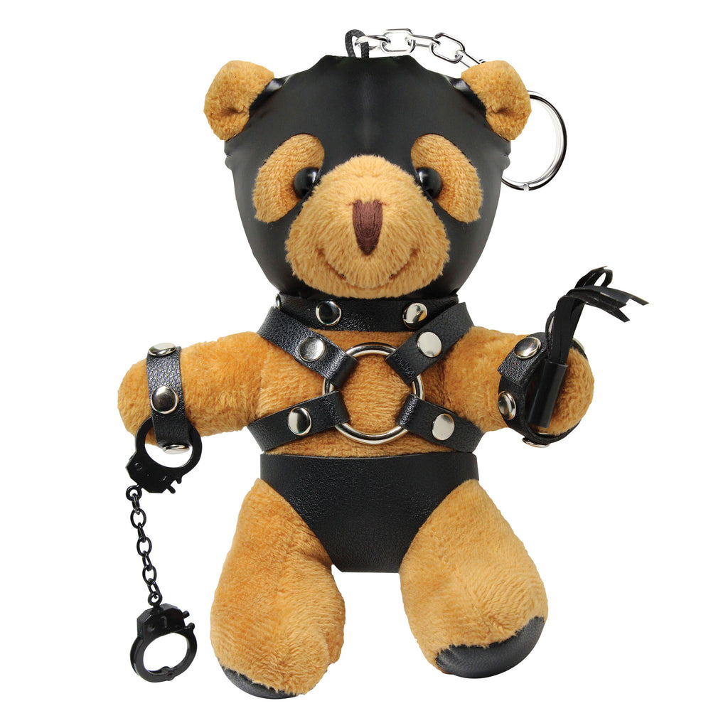 Meet the Master Bear Keychain—a delightful mix of cute and daring. This tan plush bear is dressed to impress in bondage gear, including a gimp-hood, harness, underwear, and holding handcuffs and a flogger. Attach this little rebel to your bag, purse, or keys for a constant travel buddy that screams wild fun. It's the ultimate conversation starter and a great gag gift for any party, birthday, or friend with a cheeky sense of humor. Carry this bear to show the world your fun, freaky side while enjoying a unique, stylish accessory.