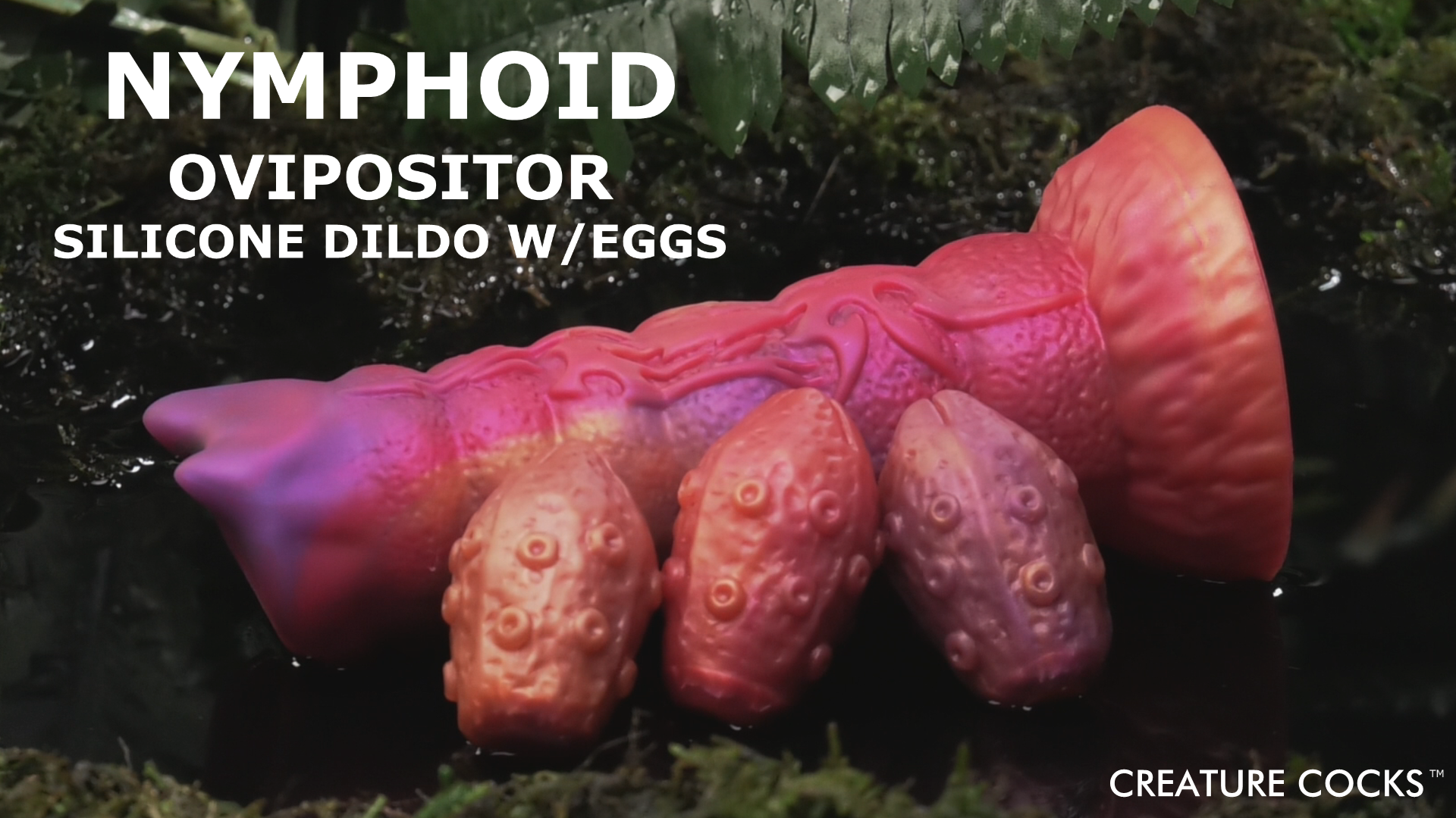 Get laid by extra-terrestrial nymphos! This Nymphoid ovipositor dildo is sunset colored with red, orange, and pink. It has an open head where 3 squishy eggs can be pushed through to be laid inside of you! The wide, flanged base is compatible with most strapon-harnesses. Roleplay the character of your dreams or nightmares with this Creature Cocks dildo and enjoy every sci-fi, fantasy, roleplay, or cosplay scene you want with this epic toy! Made out of premium, phthalate-free, body-safe silicone. Use only water-based lubricants for best results. After play is over, wash the dildo and eggs with warm water and soap and use a toy cleaner to spray clean. Wipe dry and store in a cool, dark place out of direct sunlight.
