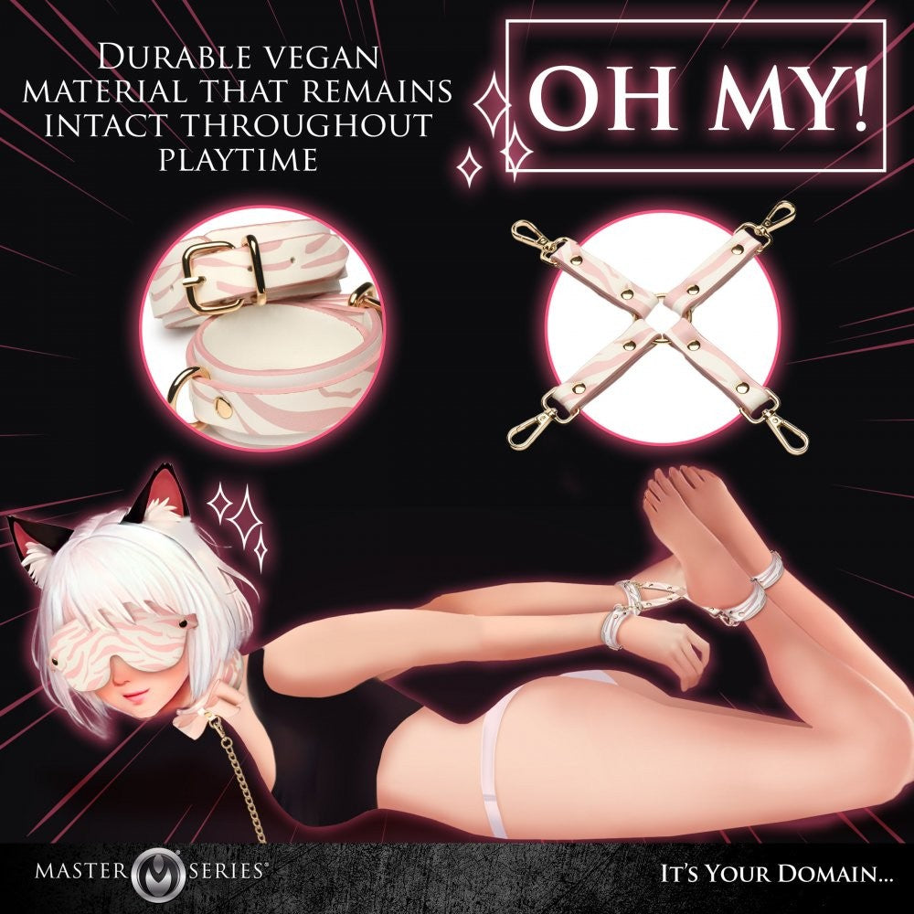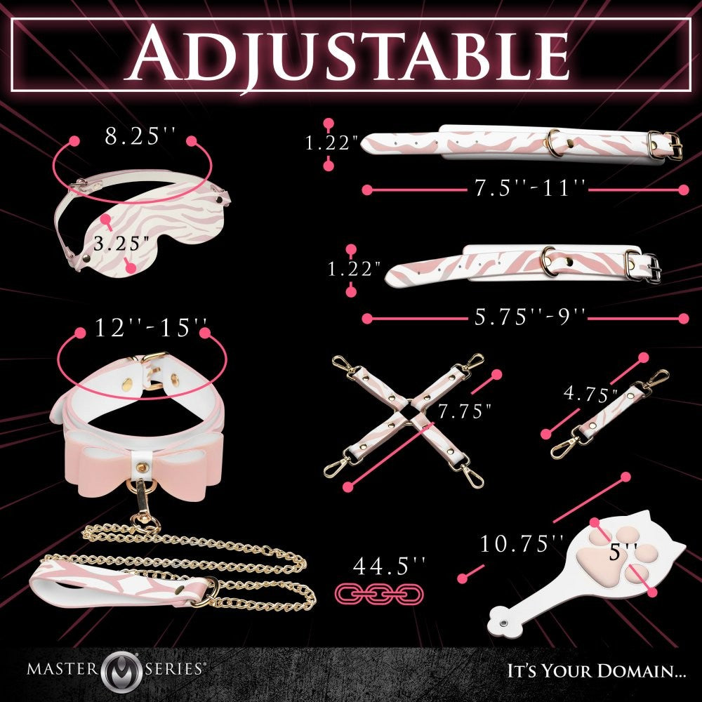 - Full Bondage Set: Everything you need for a kinky bondage scene! Included in the kit are wrist and ankle cuffs, hogtie, bowtie kitty collar and chain leash with handle, blindfold, and a padded kitty paw paddle!