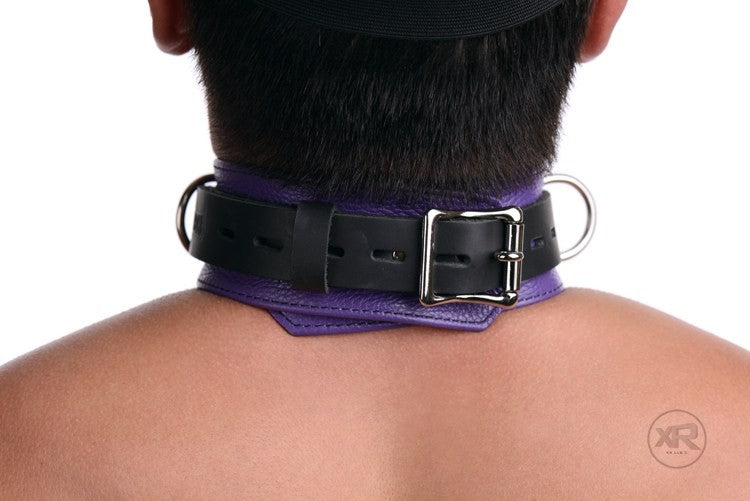 Add a little festive color to your bondage play with the Strict Leather Deluxe Black and Purple Locking Collar.