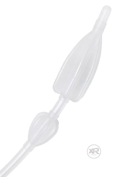 This system is designed to create the fullness of a butt plug combined with the liquid-feeling pleaures of enema play. The nozzle is inserted, into the anus, just past the first balloon. When inflated, the internal balloon create a full sensastion while the outside balloon creates a seal. At that point, the liquid can be transferred inside using the bag system or an in-line accelerator. Each bulb has an integrated release valve for quick deflation and easy removal.Silicone Inflatable Double Bulb Enema System Specs and Benefits:
