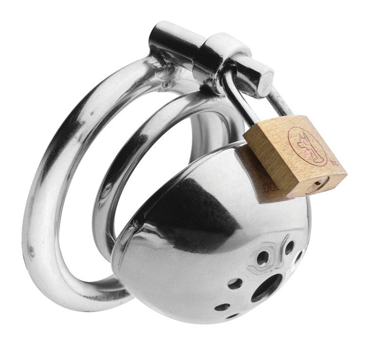 Your slave's pathetic cock won't be getting any attention while it's trapped in this intensely constricting chastity device. Pull his desperate cock and balls through one of two differently sized base rings, designed to keep your naughty sub secure in the cage. Squeeze his dick into the shaft portion and slam it shut, locking it in place so that he has no chance of escape until you set him free. He will be entirely at your mercy, unable to find release without your permission. This sturdy, stainless steel instrument of torment can be worn for as long as you desire, with a faucet feature that allows him to urinate. You hold the key to his comfort and pleasure... abuse your power!